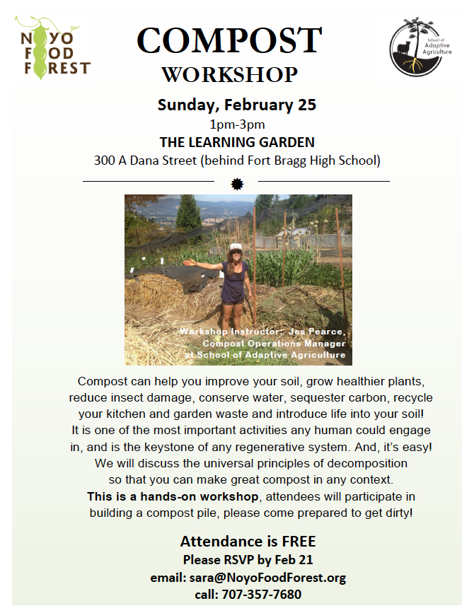 Spring is a very exciting time in the garden and we’d love to share this experience! High school students (14-18) on the Mendocino Coast interested in farming, gardening, general food production… apply now! There are limited amount of spaces available for this paid internship, and applications are due this Friday, March 2. Email Sara@NoyoFoodForest.org for…